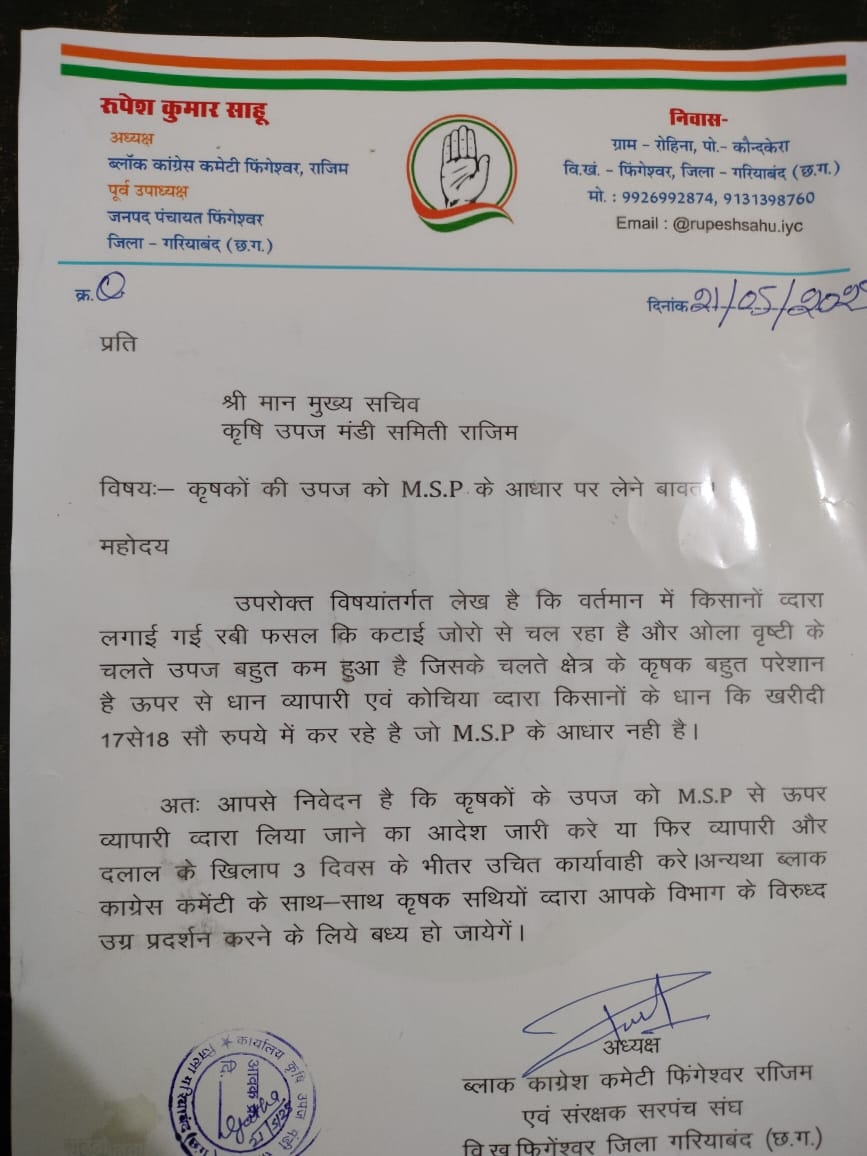 राजिम (गरियाबंद) ।एम एस पी पर धान खरीदी की मांग : ब्लॉक अध्यक्ष रुपेश साहू ने एम एस पी दर पर धान खरीदी की मांग, सौंपा ज्ञापन...