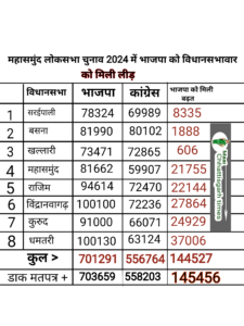 यहां यह बताना लाजमी है कि लोकसभा 2019 का चुनाव भाजपा ने 90511 मतो के अंतर से जीता था वही वही 2023 के विधानसभा चुनाव में चार विधानसभा में भाजपा ने तो चार पर कांग्रेस ने जीत दर्ज की थी लेकिन समूचे लोकसभा क्षेत्र में भाजपा एवं कांग्रेस को मिले कुल मतो के आधार पर कांग्रेस ने भाजपा पर 9483 मतो की बढ़त बना ली थी। यहां भाजपा ने रूपकुमारी को पहले से ही अपना कैंडिडेट घोषित कर दिया था जिसे कांग्रेसी हल्के में लूज कैंडिडेट माना जा रहा था, इस अनुकूल स्थिति को देखकर लोकसभा चुनाव में इस सीट पर प्रदेश के बड़े हाई प्रोफाइल नेताओं की नजरेें टिकी हुई थी,और कांग्रेस ने अंततः अपने सोशल इंजीनियरिंग फार्मूले के तहत साहू समाज के कद्दावर नेता वह संसदीय सीट के अंतर्गत गरियाबंद और महासमुंद जिले के प्रभारी मंत्री रहे ताम्रध्वज साहू को दुर्ग से हटा बतौर कांग्रेस प्रत्याशी महासमुंद शिफ्ट कर दिया ,साहू के नाम की घोषणा होती ही कांग्रेस में ही उनके बाहरी होने के मुद्दे पर विरोध और बगावत शुरू होने लगे विरोध में सरायपाली बसना से लेकर धमतरी तक बड़ी संख्या में नेताओं व पार्टी कार्यकर्ताओं ने कांग्रेस छोड़ भाजपा ज्वाइन कर लिए ।समय गुजरने के साथ मामला सतही तौर पर शांत तो हो गया लेकिन अंदरूनी हल्के में नाराजगी कायम रही जनता ने भी 'स्थानीय बनाम बाहरी' के मुद्दे पर वोटिंग करते हुए कांग्रेस के सोशल इंजीनियरिंग फार्मूले को सिरे से खारिज कर दिया।जिन विधानसभा क्षेत्रों से कांग्रेस प्रत्याशी को निर्णायक बड़ी लीड़ तय मान रहे थे वही से वे बड़े अंतर से बुरी तरह पिछड़ गए।